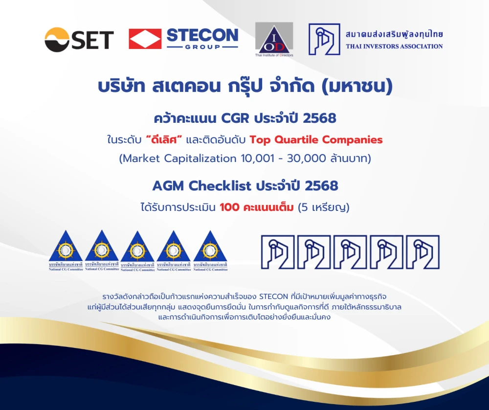 In addition, STECON achieved a perfect score of 100 points (5 medals) in the 2025 “Quality Assessment of Annual General Meetings (AGM Checklist)” project organized by the Thai Investors Association and the Securities and Exchange Commission (SEC).